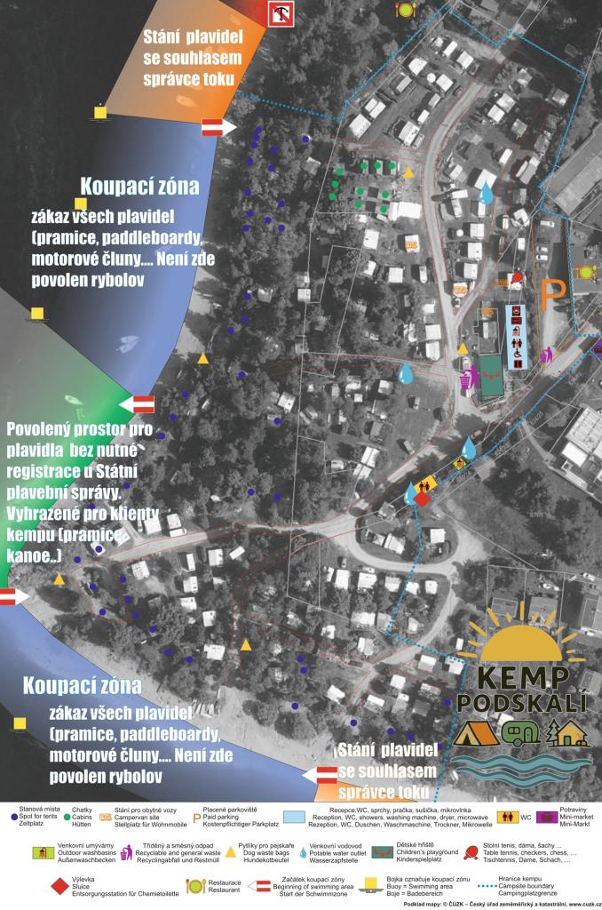 V kempu se nabízí nejen místa pro karavany ale i místa pro stany. Dále nabízíme k rekreaci 10 chatek a stany pro 5 a 6 osob, které jsou pro Vás v kempu připraveny i s veškerým potřebným zázemím. V kempu si od nás můžete zapůjčit gril s uhlím, můžete si u nás vyprat a třeba i ohřát příkrm pro Vaší malou ratolest. Na mapce jsou vyznačeny mimo jiné koupací zóny. Zde je třeba dbát, aby do této zóny nevjížděla žádná plavidla ani neparkovala na pláži v těchto sektorech.